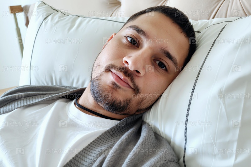 Портрет молодого взрослого испаноязычного мужчины, отдыхающего в постели и смотрящего на камеру