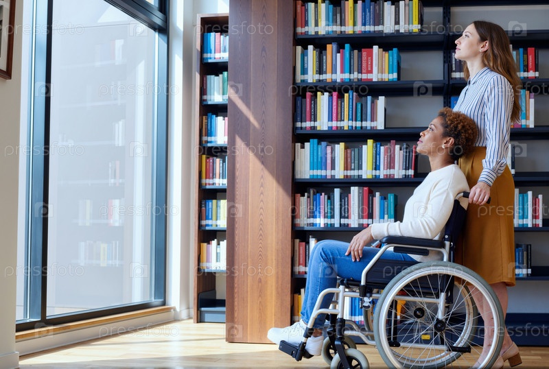 Молодая женщина помогает молодой чернокожей женщине с инвалидностью в библиотеке