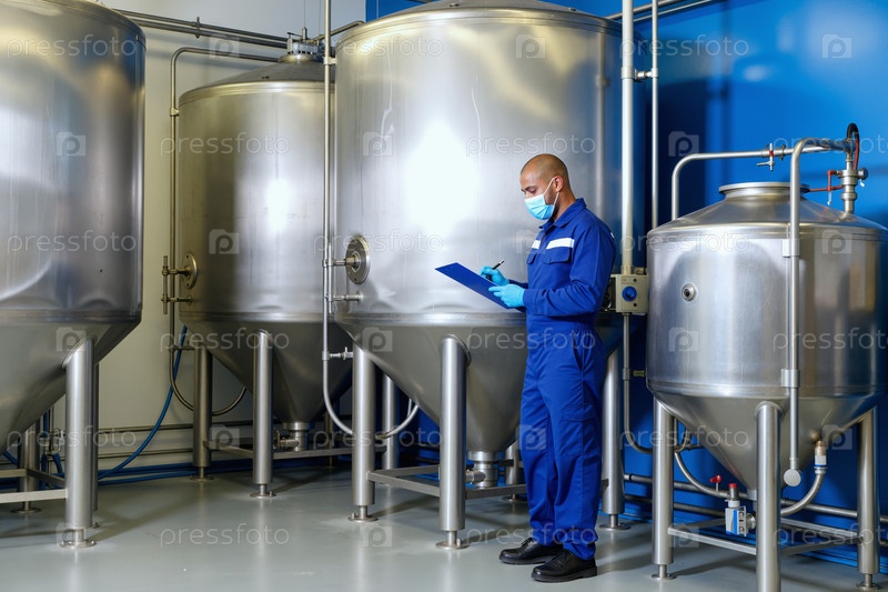 Человек, инспектирующий промышленные танки в современном заводском помещении