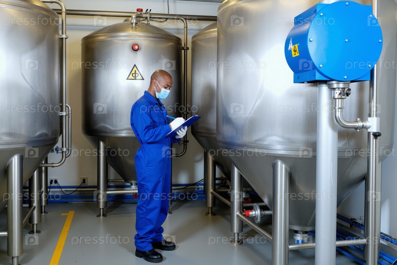 Бирациальный мужчина, инспектирующий промышленные танки в защитной рабочей одежде