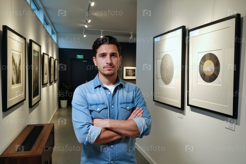 Портрет молодого взрослого мужчины, уверенно стоящего в художественной галерее
