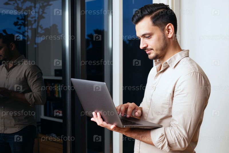 Молодой взрослый мужчина использует ноутбук, стоя возле окна в помещении