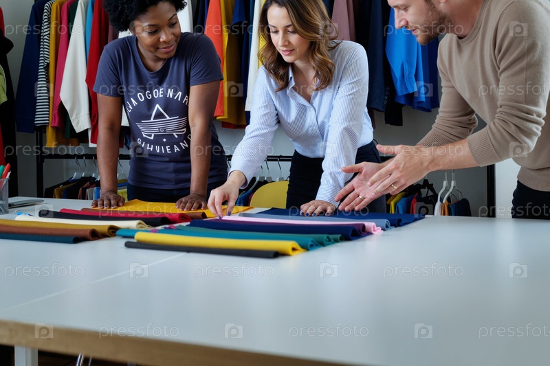 Мультиэтнические молодые взрослые сотрудничают над выбором текстиля в модной студии