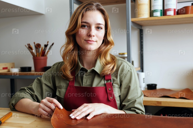 Портрет молодой взрослой женщины, изготавливающей кожаные изделия в мастерской