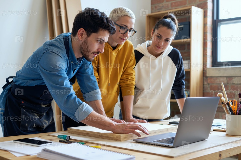 Молодой человек сотрудничает с двумя молодыми женщинами, используя ноутбук в помещении