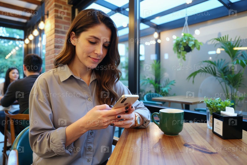 Молодая женщина сидит в кафе, использует смартфон и улыбается