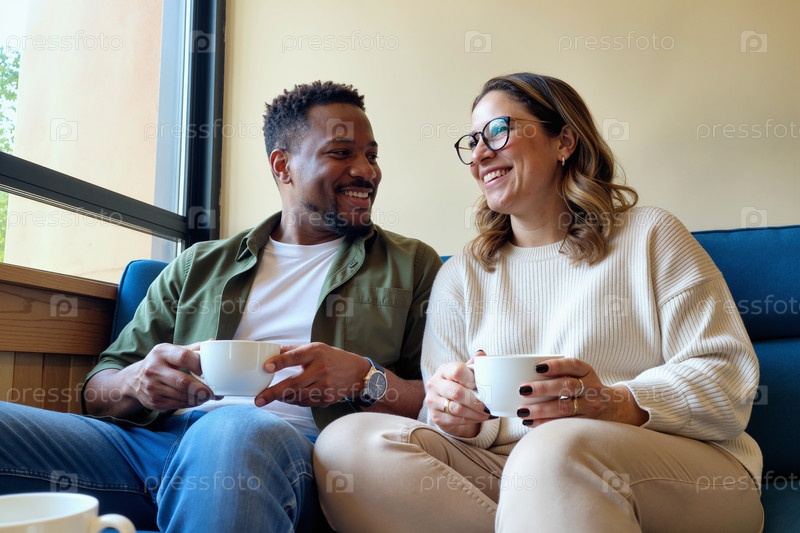 Молодой взрослый чернокожий мужчина и женщина улыбаются, пьют кофе вместе