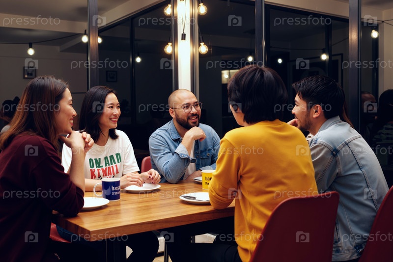Социализирующая группа молодых азиатских друзей, сидящих за столом