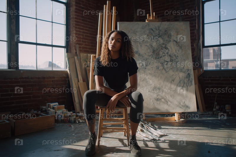 Портрет молодой взрослой чернокожей женщины, сидящей уверенно в художественной студии
