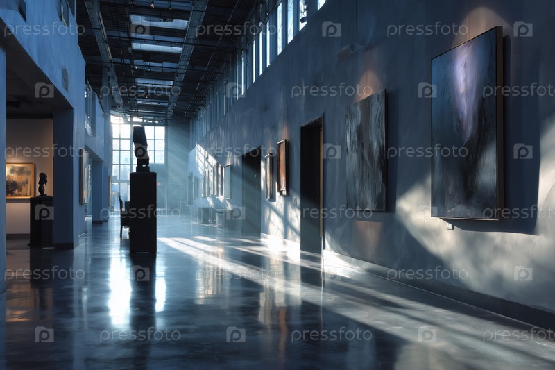 Пустая галерея современного искусства Зал просветленный утренним солнечным светом