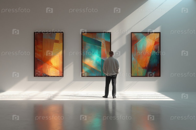 Человек средних лет наблюдает абстрактные картины в галерее современного искусства