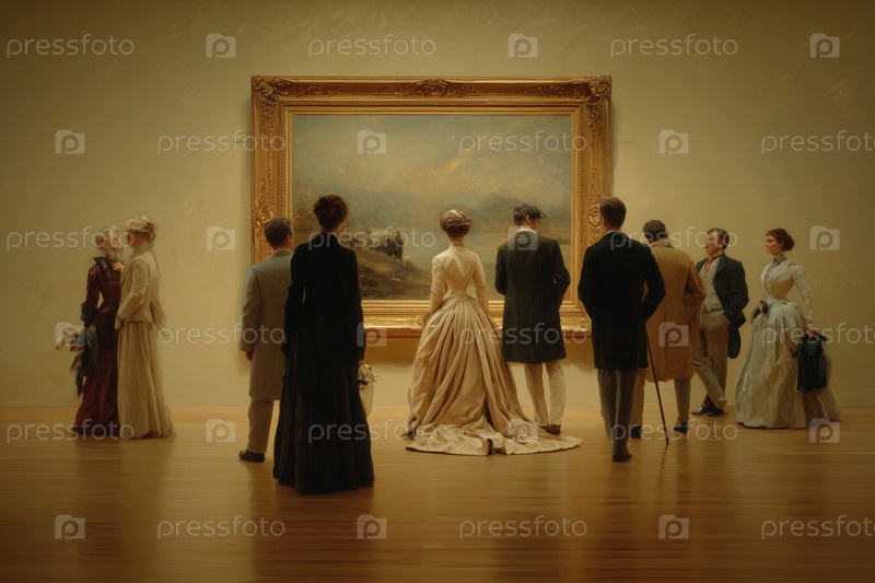 Группа взрослых, наблюдающих за живописью на выставке в художественной галерее