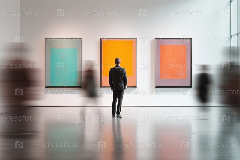 Человек средних лет наблюдает абстрактные картины в галерее современного искусства