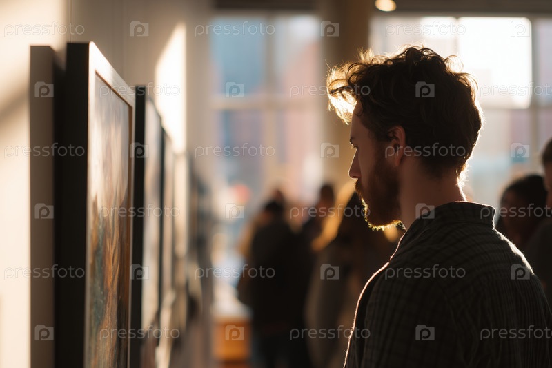 Молодой человек, наблюдающий за произведениями искусства на выставке галереи современного искусства