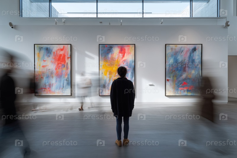 Молодая женщина наблюдает абстрактные картины в галерее современного искусства