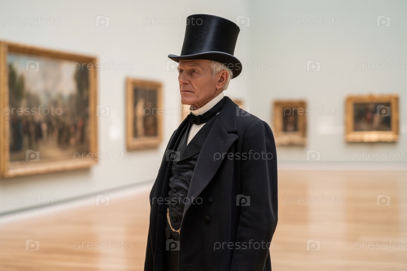 Мужчина в верхней шляпе стоит в художественной галерее, наблюдая за картинками старшего