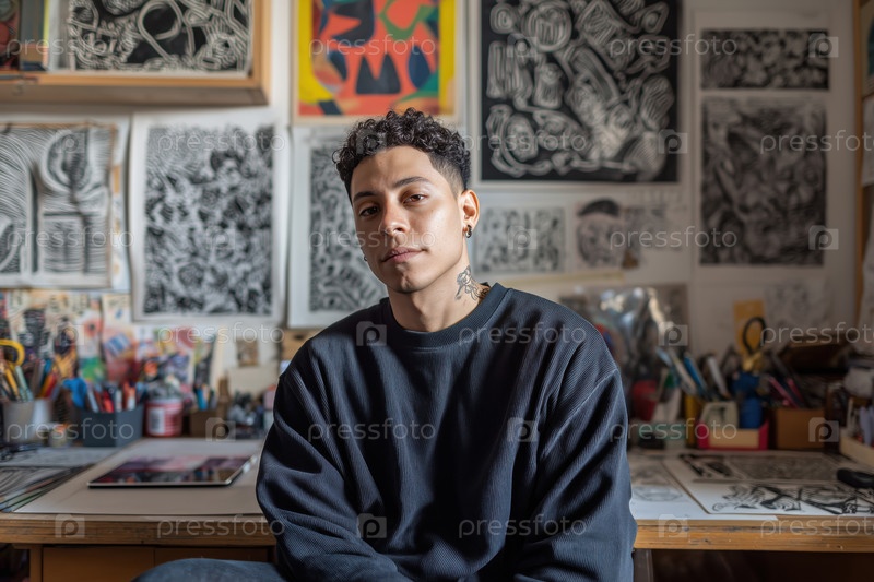 Портрет молодого взрослого испаноязычного мужчины, сидящего в художественной студии вокруг рисунков