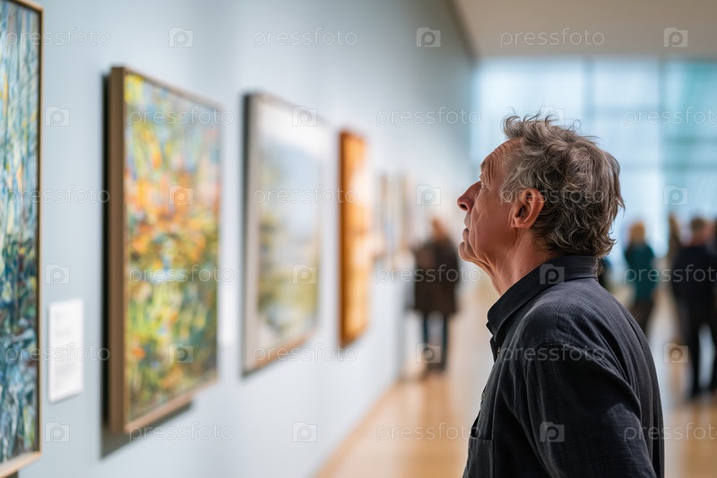 Человек средних лет наблюдает за картинами в галерее современного искусства