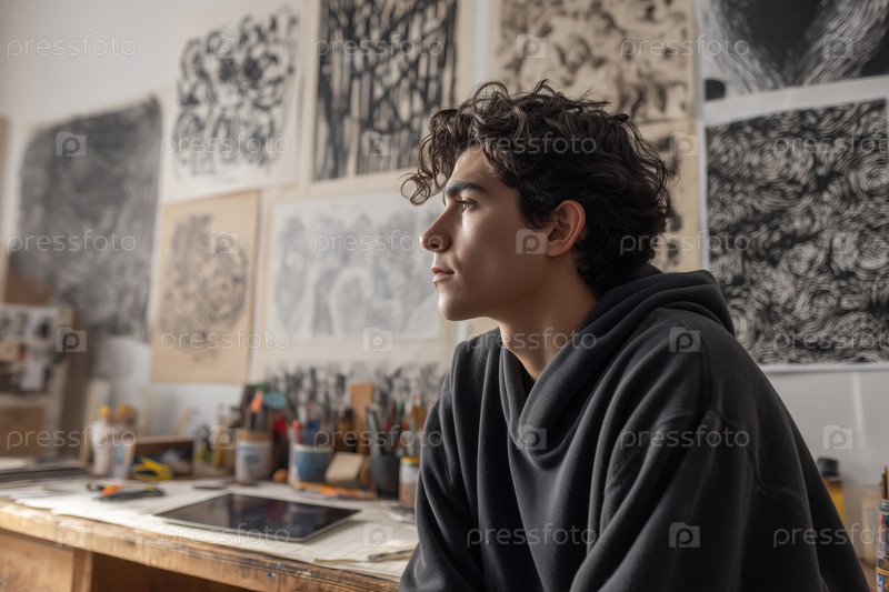 Молодой человек сидит в художественной студии, размышляя вокруг рисунков