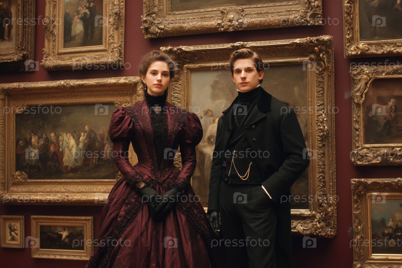 Молодая женщина и молодой мужчина позируют в художественной галерее
