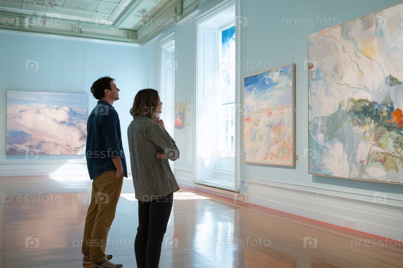 Молодой мужчина и женщина наблюдают абстрактные картины в художественной галерее