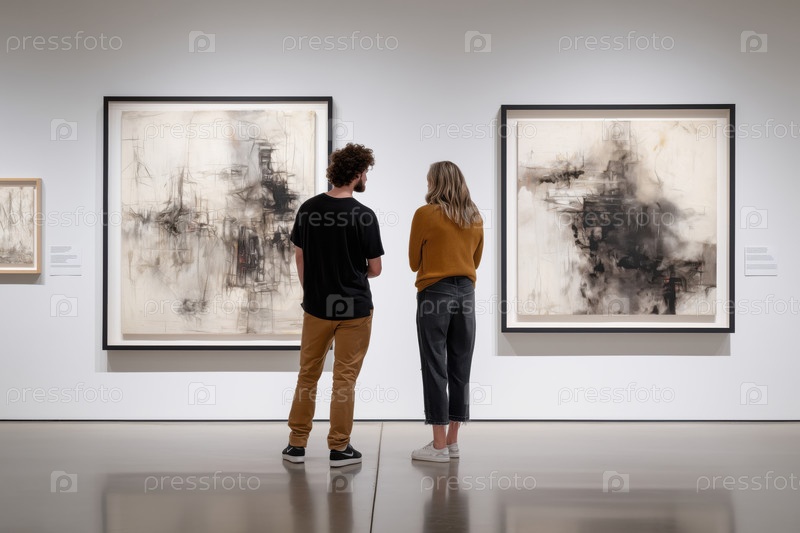 Молодой взрослый мужчина и женщина обсуждают абстрактные произведения искусства в галерее
