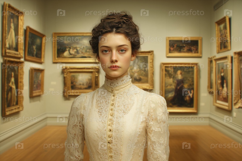Портрет молодой взрослой женщины, стоящей среди классических масляных картин