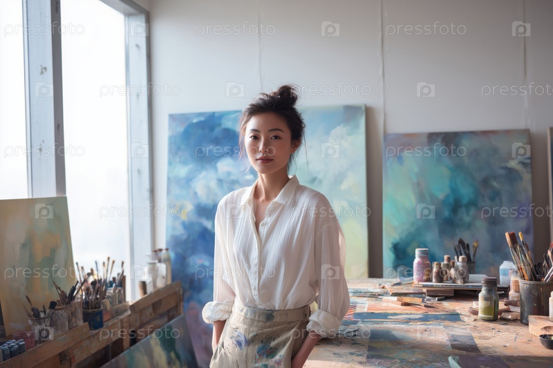 Портрет молодой взрослой азиатской женщины, уверенно стоящей в художественной студии