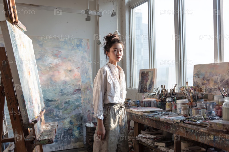 Молодая взрослая азиатская женщина стоит в художественной студии, окруженная картинами