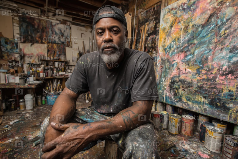 Портрет чернокожего человека среднего возраста, сидящего в художественной студии вокруг картин