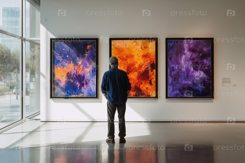 Человек средних лет, стоящий в одиночестве и изучающий яркие абстрактные картины