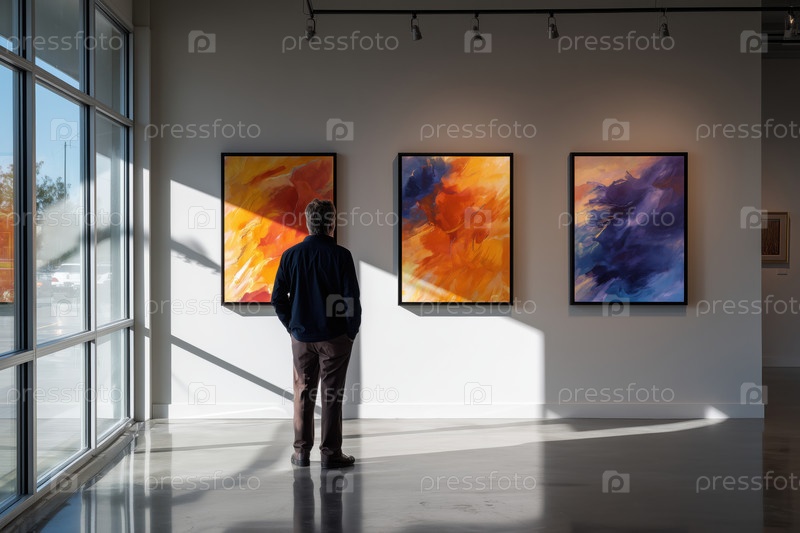 Человек среднего возраста, стоящий в одиночестве и восхищающийся яркими абстрактными картинами