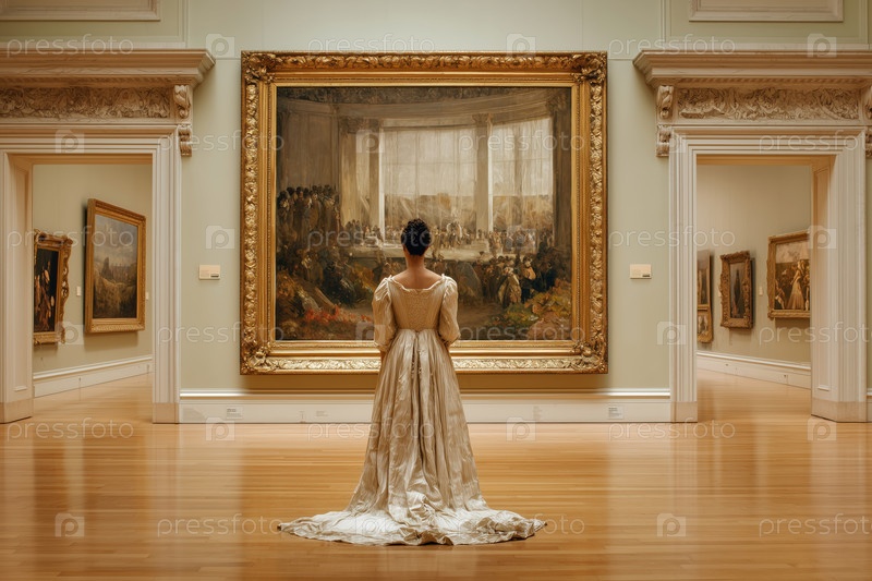 Молодая взрослая женщина в халате наблюдает за живописью в художественной галерее