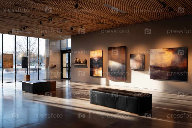Пустая галерея современного искусства выставляет абстрактные картины днем