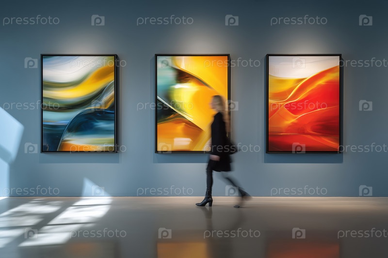 Молодая взрослая женщина проходит мимо ярких абстрактных картин в галерее