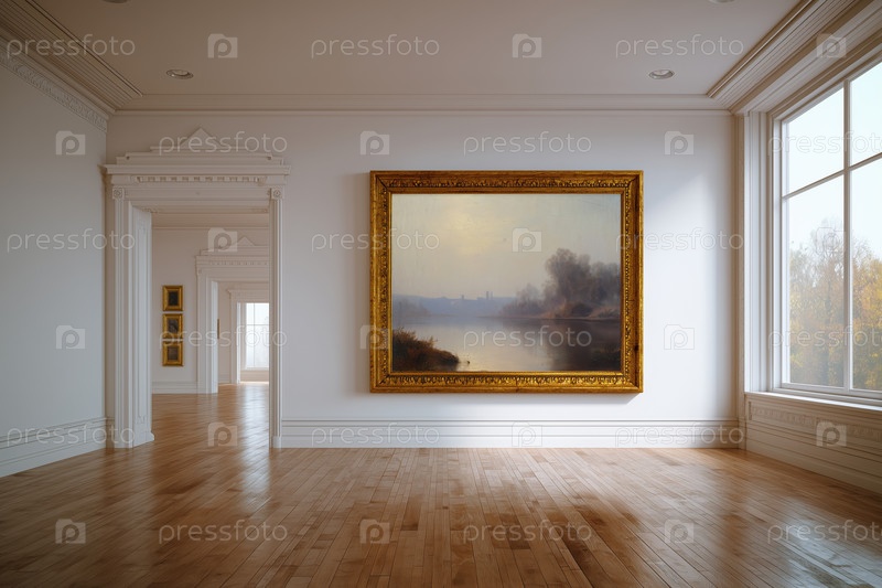 Пустая художественная галерея с обрамленной пейзажной живописью, висящей на стене