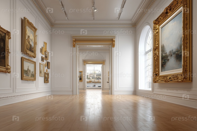 Пустая художественная галерея демонстрирует рамочные картины в элегантном выставочном пространстве