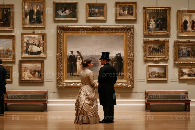 Молодая женщина и мужчина в исторических костюмах посещают художественную галерею