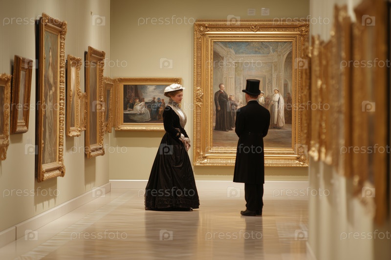 Мужчина и женщина в викторианском наряде наблюдают за картинами в художественной галерее