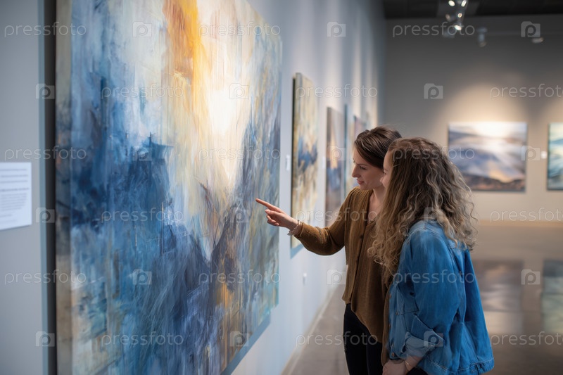 Две молодые женщины наблюдают абстрактную живопись в галерее современного искусства