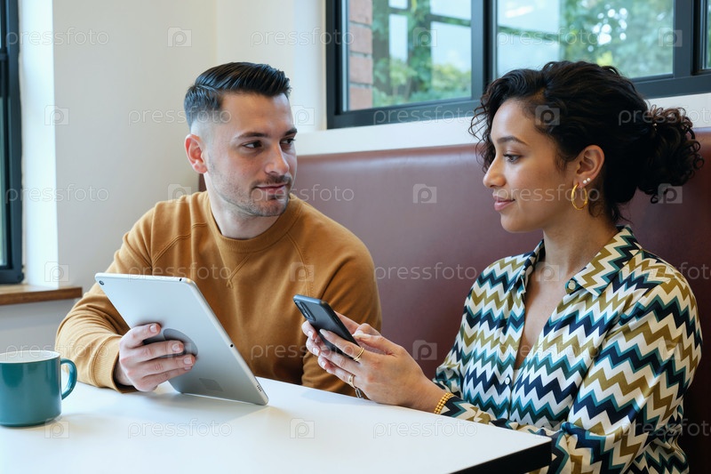 Молодой мужчина и женщина используют цифровые устройства в кафе