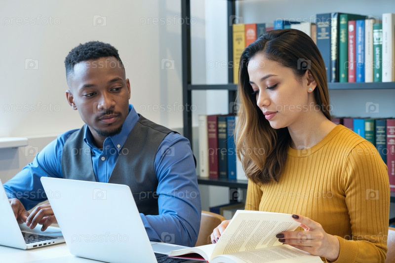Молодой чернокожий мужчина и молодая женщина учатся вместе в библиотеке