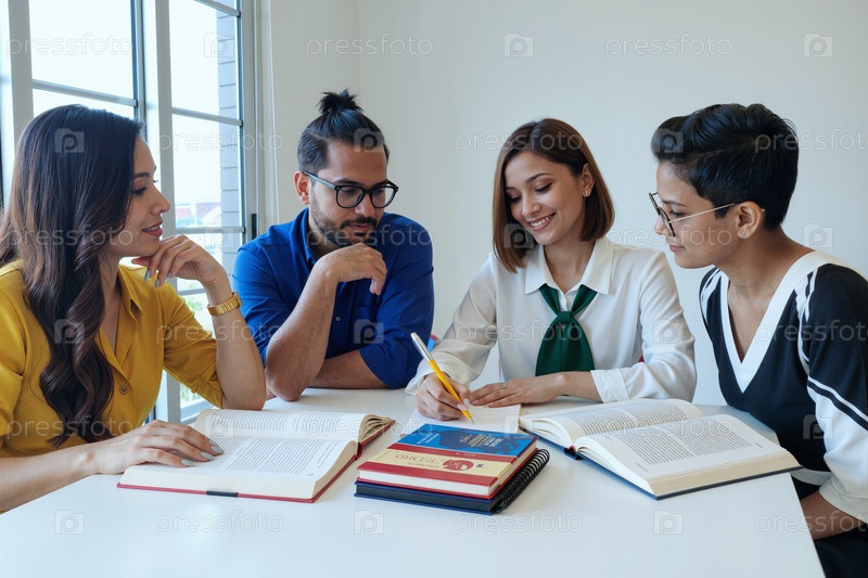 Мультиэтнические молодые люди мозговой штурм идей вместе во время учебы в помещении