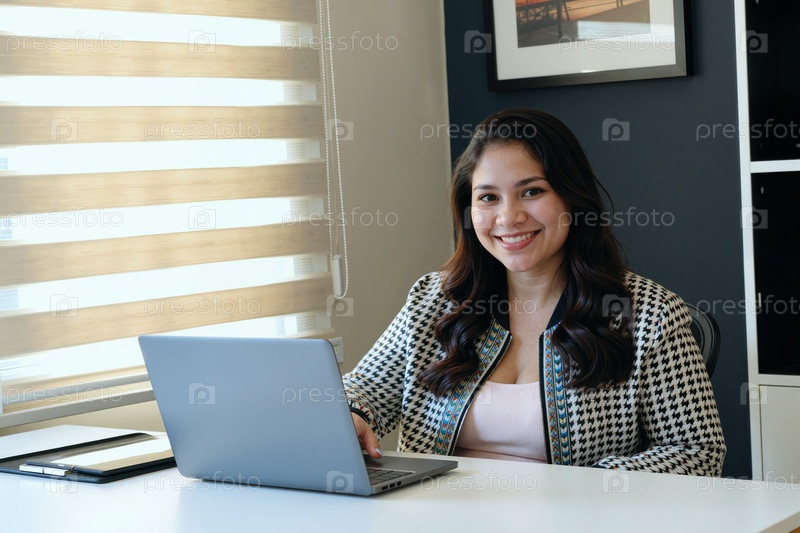 Портрет молодой азиатской женщины, улыбающейся во время работы на ноутбуке