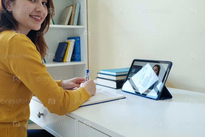 Молодая женщина учится, посещая онлайн-класс на планшете