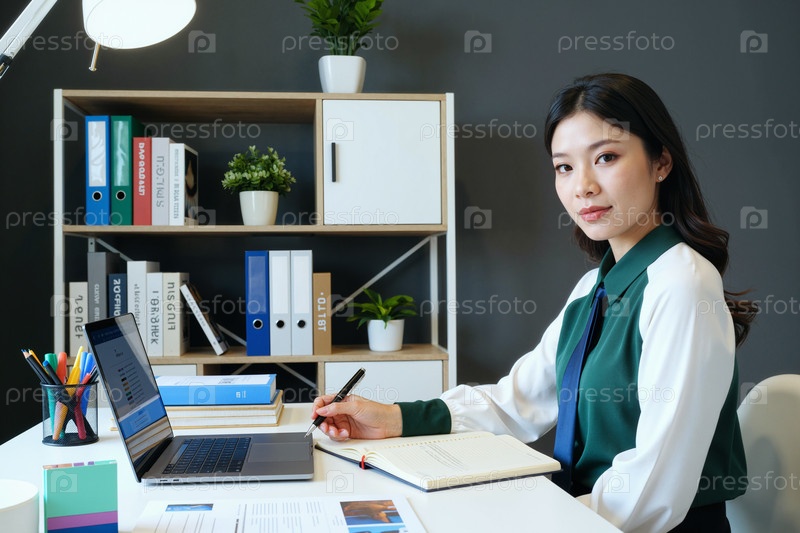 Портрет молодой азиатской женщины, работающей за столом в современной офисной обстановке