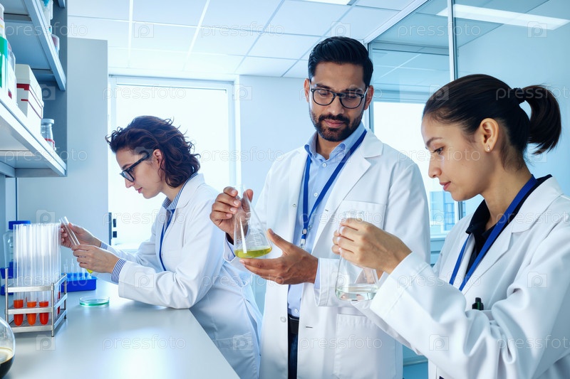 Мультиэтнические молодые взрослые ученые проводят химический эксперимент в лаборатории