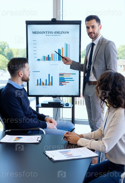 Молодой взрослый мужчина, ведущий бизнес-презентацию для различных коллег