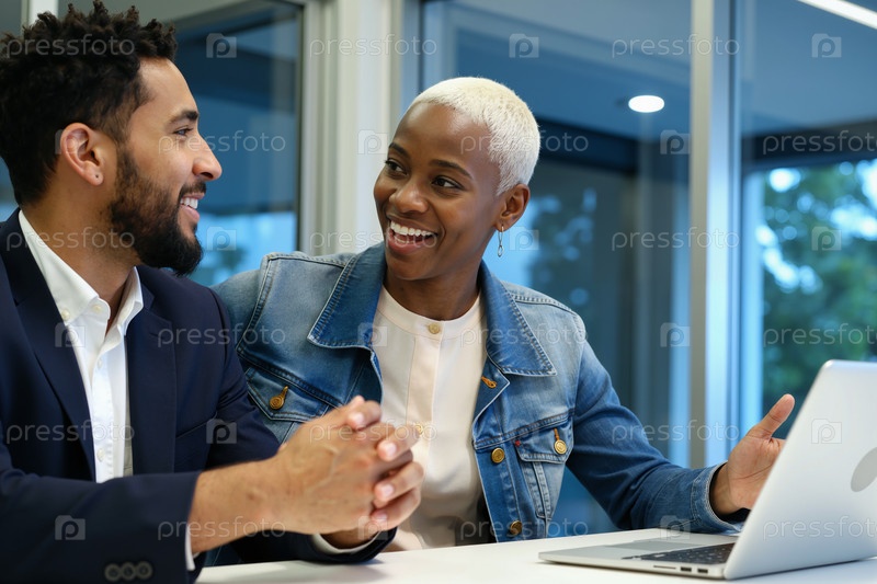 Молодая взрослая черная женщина и молодой взрослый черный мужчина сотрудничают в офисе
