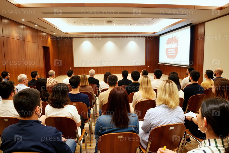 Разнообразная группа взрослых, посещающих деловую презентацию в конференц-зале